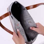 - Diseño moderno en fieltro gris y cuero sintético toffee